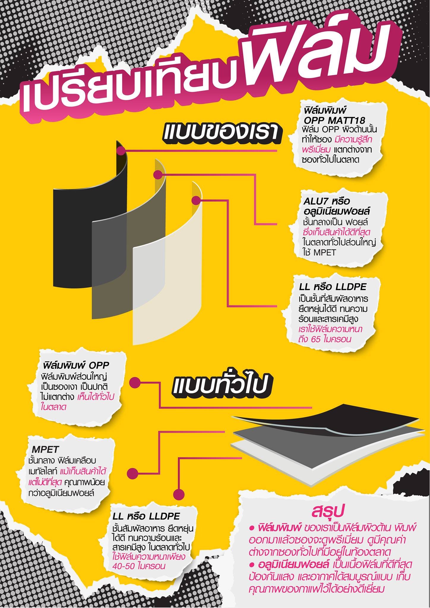 ซองทั่วไปจะเป็นฟิล์มพิมพ์ OPP ซึ่งโดยทั่วไปจะเป็นซองเงา เห็นได้ปกติตามท้องตลาด ดูไม่แตกต่าง